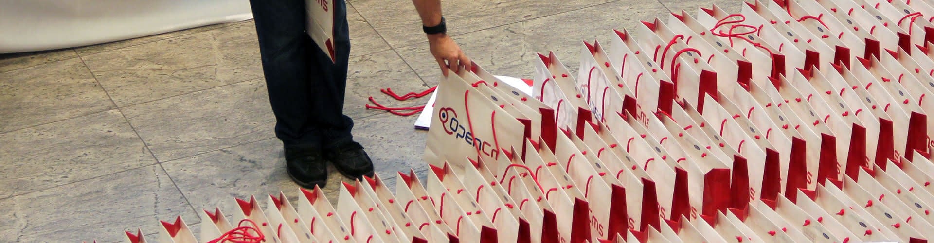 Several OpenCms bags standing in a row